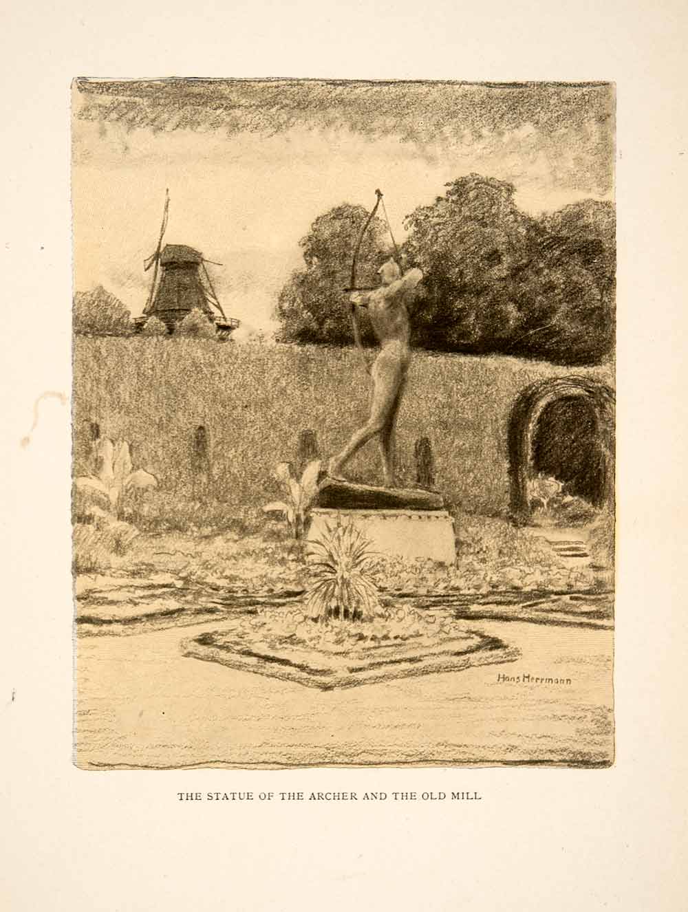 1909 Photolithograph Hans Herrmann Statue Archer Old Wind Mill Potsdam Art XGCB3