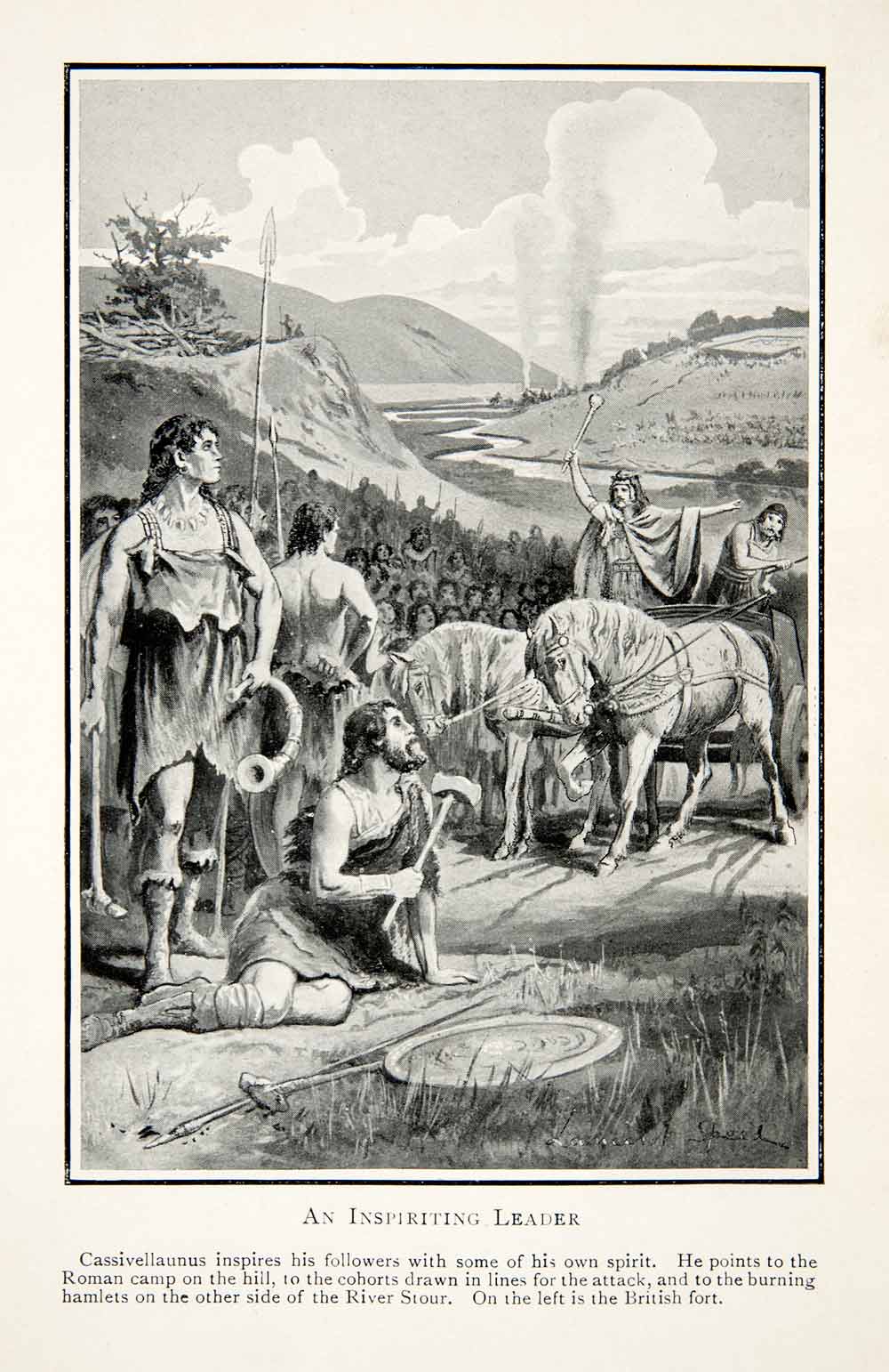 This is an original 1909 black and white halftone print of Briton Chieftain, Cassivellanus creating a tribal military alliance to fight against the invading Roman army.