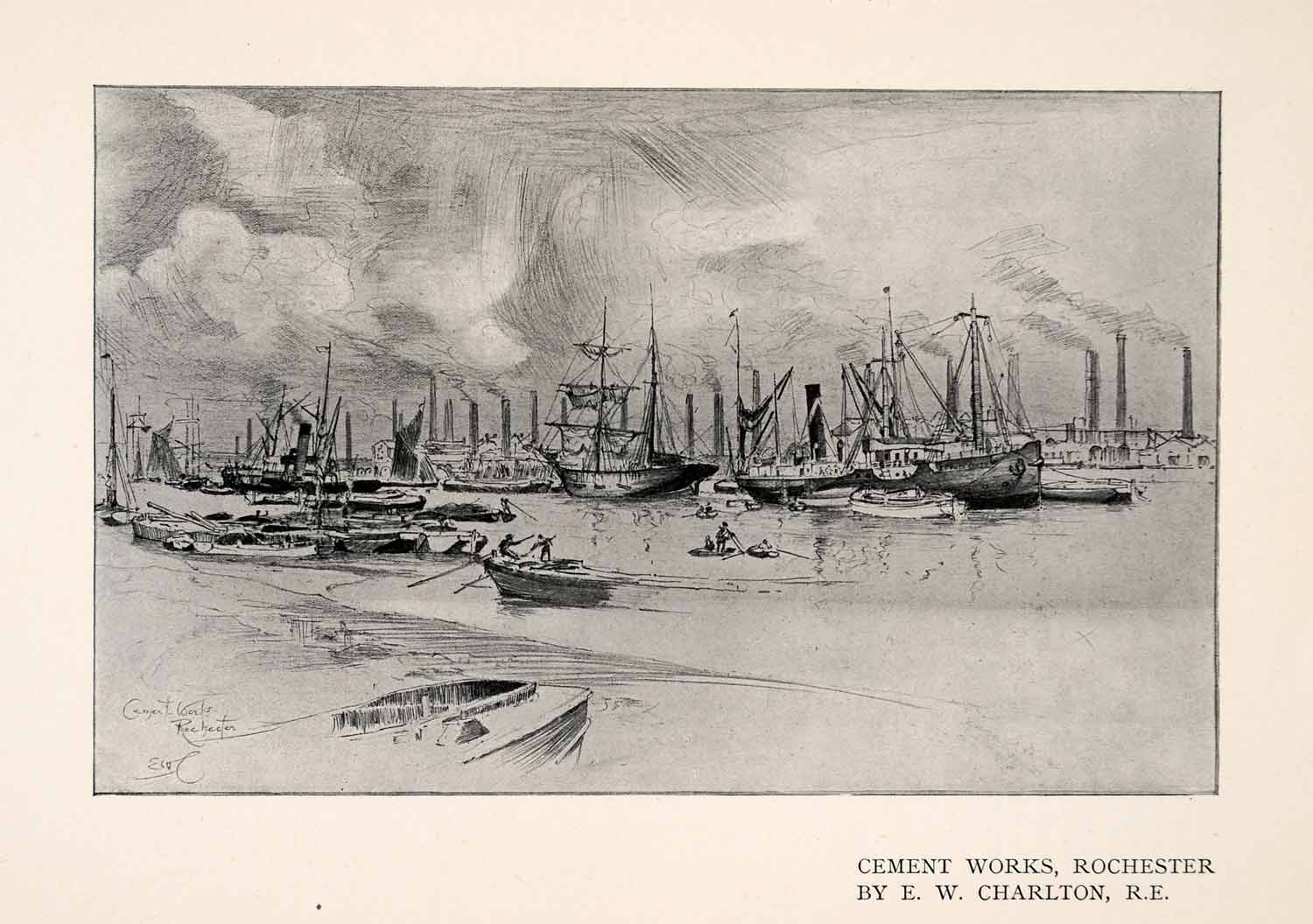 This is an original 1909 halftone print of a piece titled "Cement Works, Rochester" by E. W. Charlton.