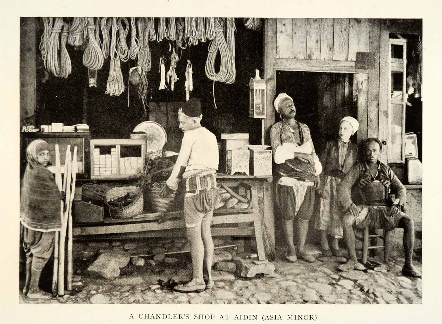 This is an original 1909 halftone print of a chandler's shop in Aydin (formerly Aidin), Turkey.