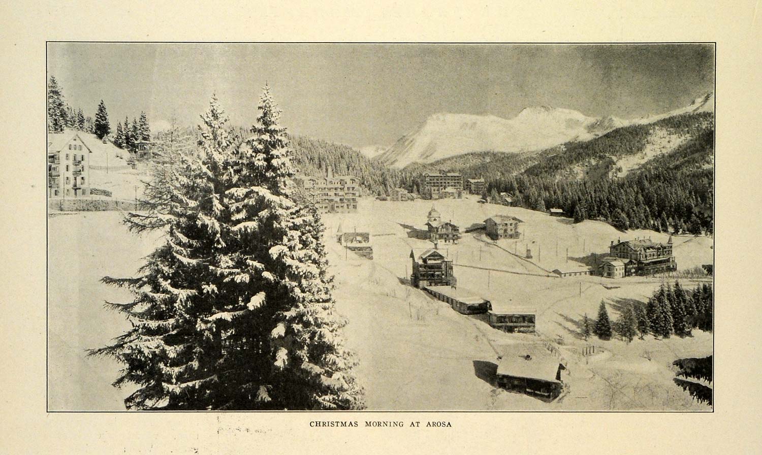 This is an original 1909 halftone print of a Christmas morning at Arosa, a municipality in the district of Plessur, the canton of Graubunden in Switzerland.