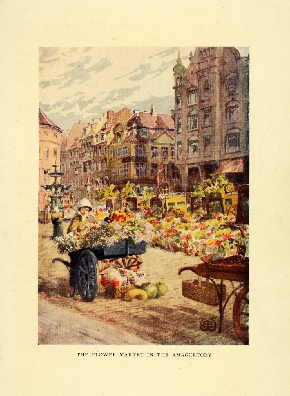 This is an original 1909 color print of the flower market at Amager Square in Copenhagen, Denmark. In the far left is the famous Stork Fountain.