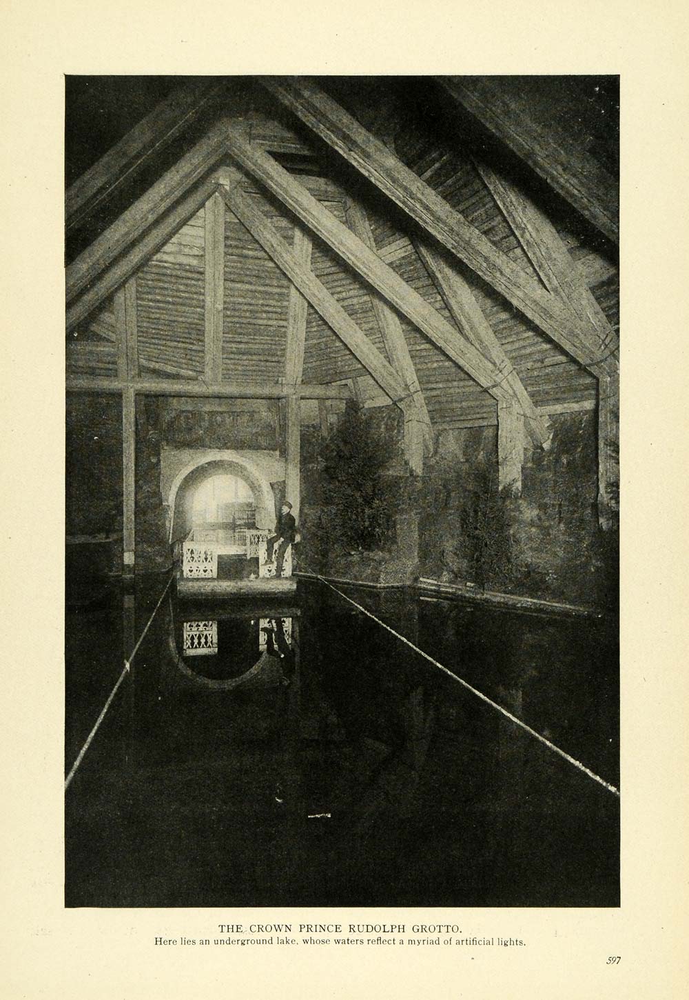 This is an original 1909 halftone print of the Crown Prince Rudolph Grotto in Vienna (the biggest subterranean lake in Europe) which has an underground lake, and the water aids in reflecting the artificial lighting to keep the cavern aglow.