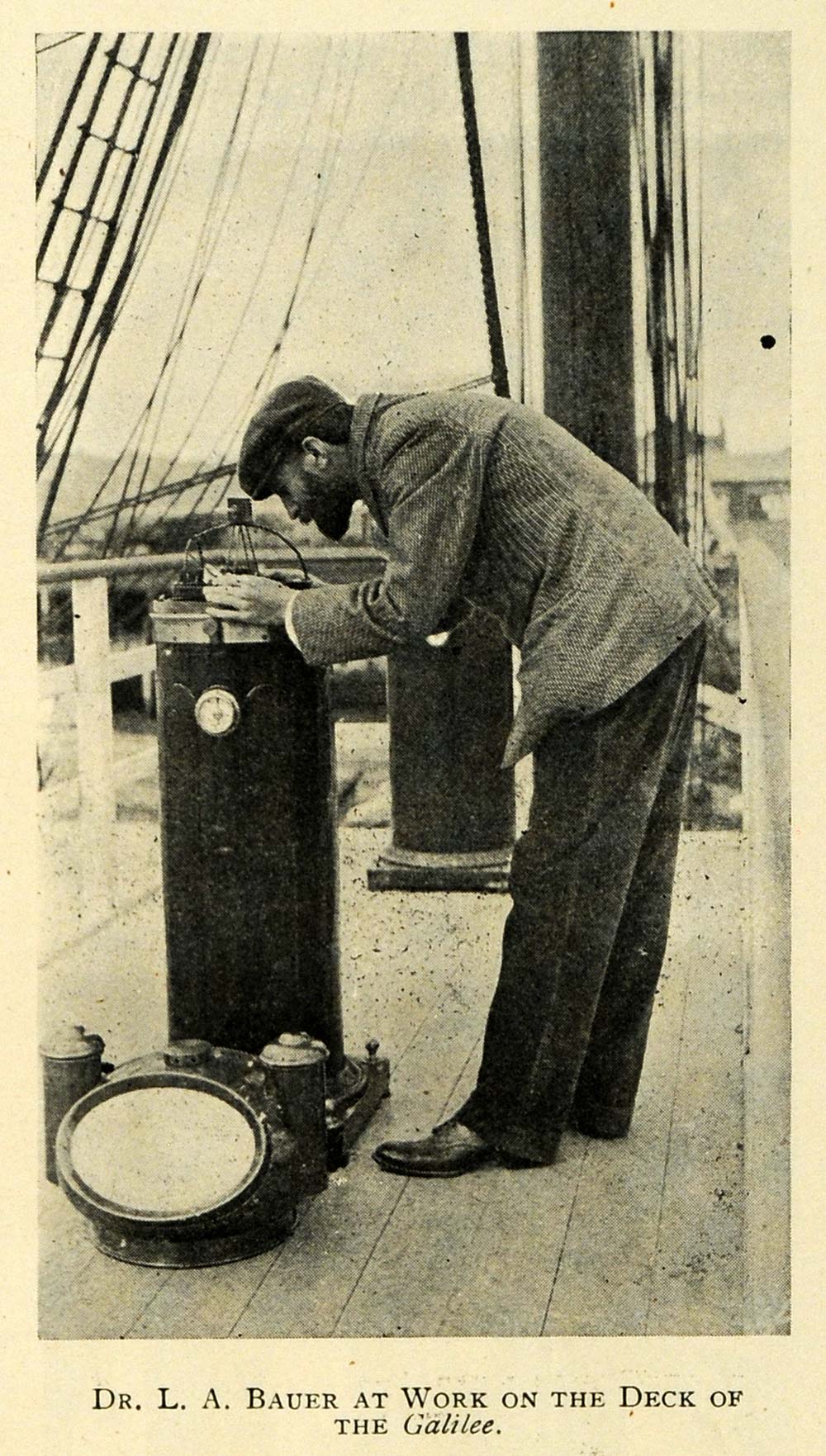 This is an original 1909 halftone print of Dr. L. A. Bauer on the deck of the yacht,