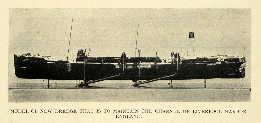 This is an original 1909 halftone print of the model of a dredge that was to maintain the channel of Liverpool Harbor, England. Its purpose was to keep the water level at the mouth of the channel high enough for larger water vessels to come through.
