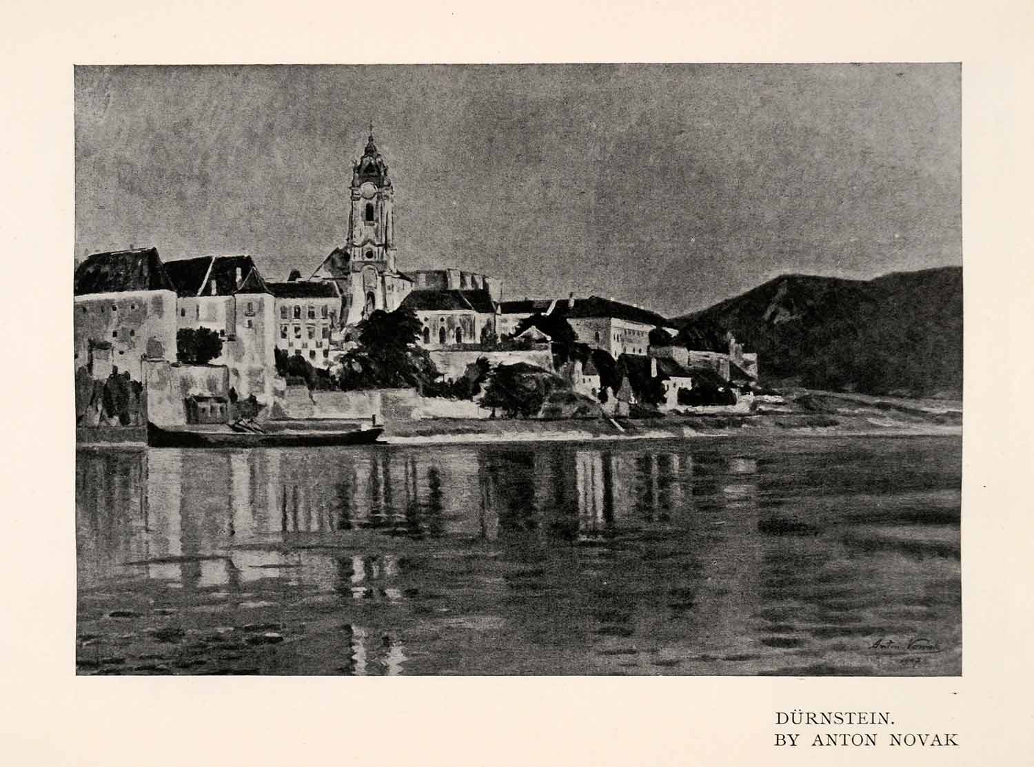 This is an original 1909 halftone print of a piece titled "Dürnstein" by Anton Novak. Dürnstein is a small town in Austria and is known for being a great wine growing area.