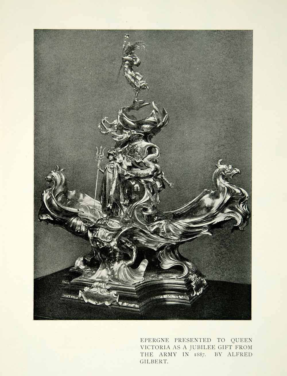 This is an original 1909 monochrome halftone print of the Epergne which was presented to Queen Victoria as a jubilee gift from the Army in 1887. This piece was created by Alfred Gilbert.