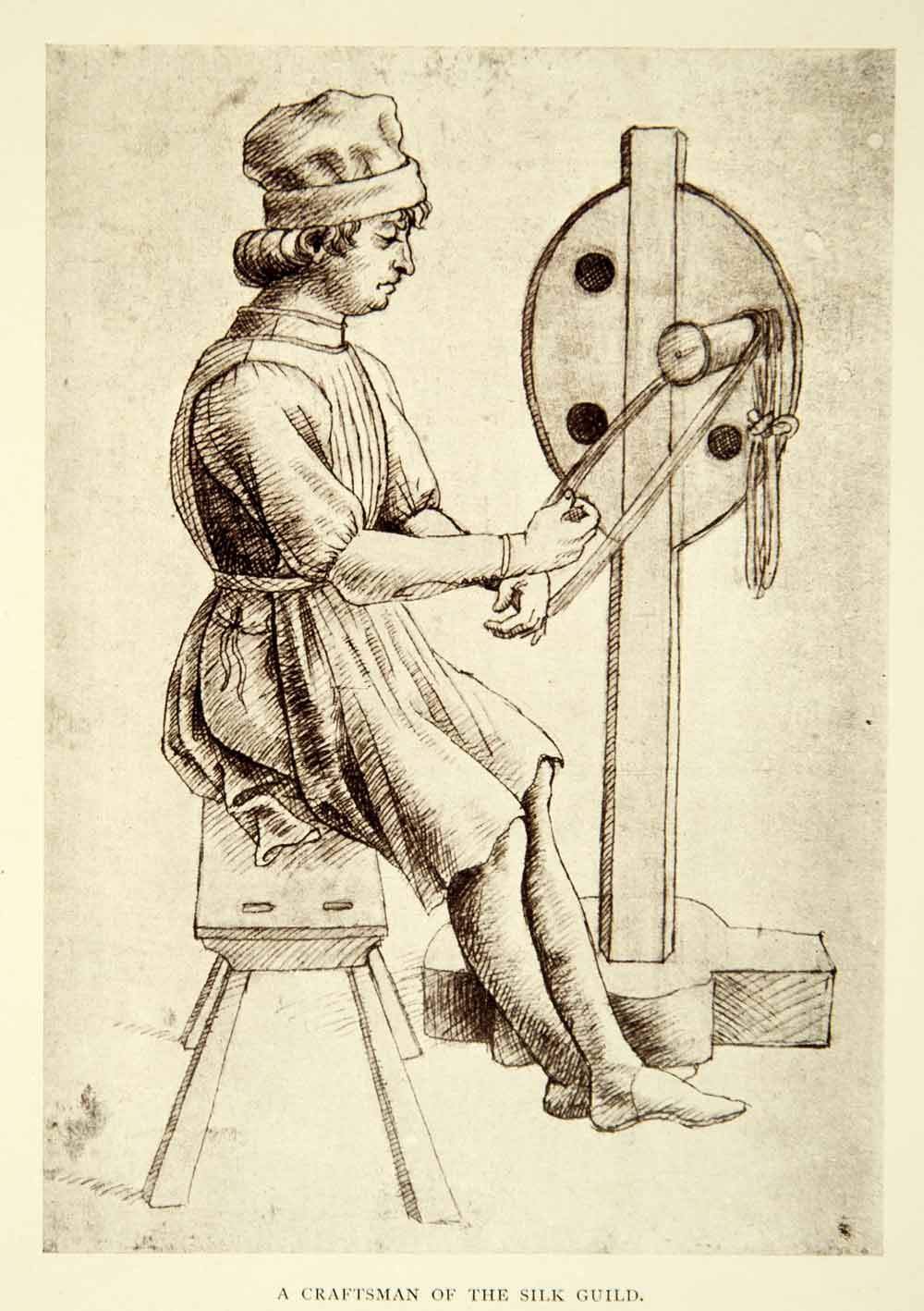 This is an original 1909 sepia halftone print of a illustration of a craftsman of the silk guild or Arte della Seta from a miniature in the Riccardi Library in Florence, Italy.
