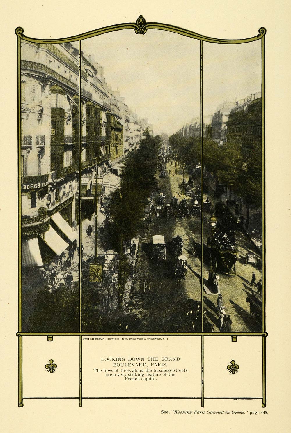 This is an original 1909 color print of the view down the Grand Boulevard of Paris, France; the road is lined with trees, pedestrians, and businesses.