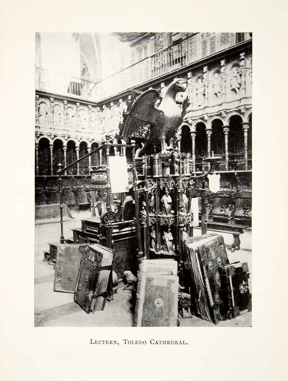 This is an original 1909 black and white halftone print of the lectern in the Primate Cathedral of Saint Mary of Toledo which is located in the city of Toledo, Spain. This cathedral is one of three High Gothic cathedrals in Spain that were built in the 13th century AD.