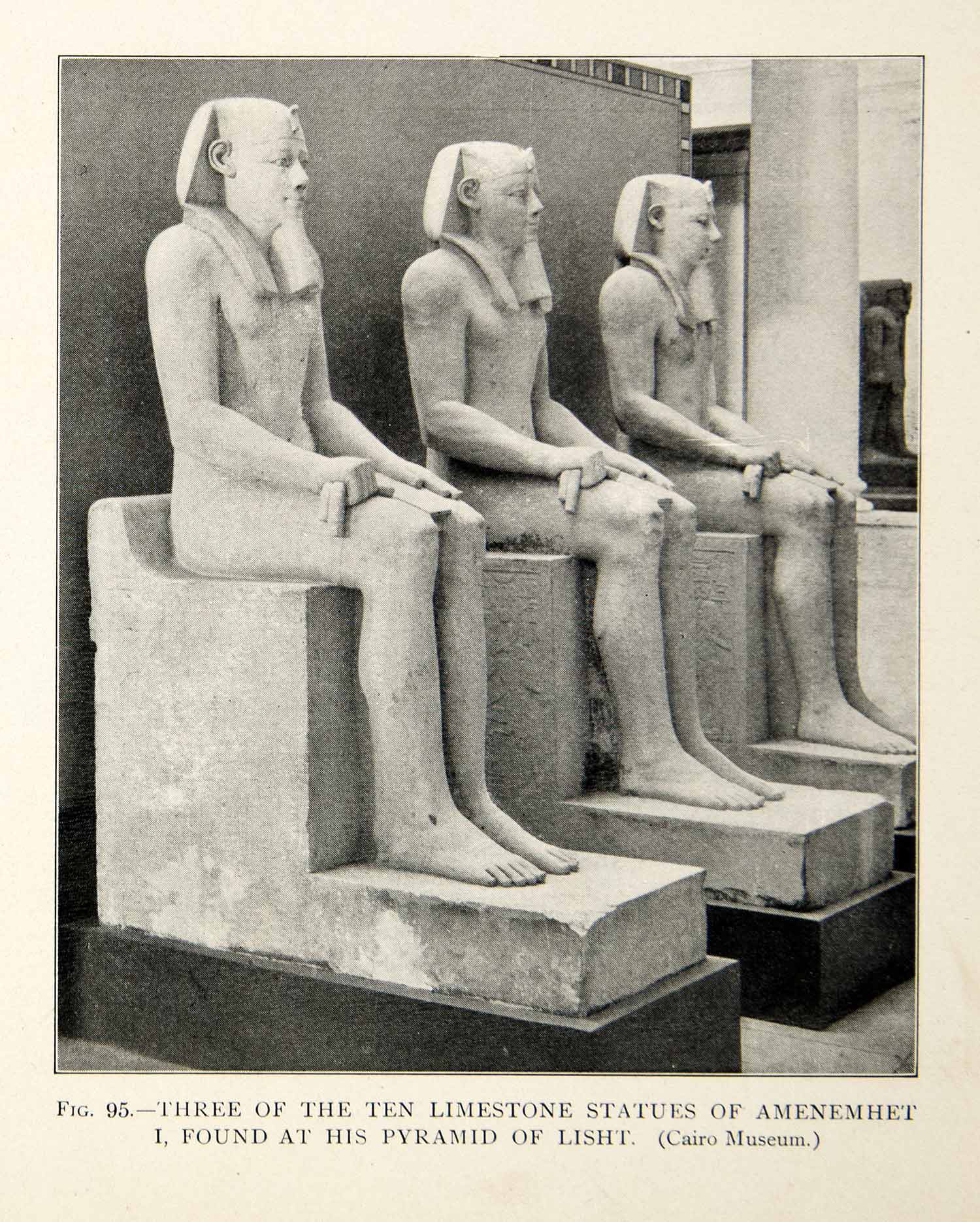 This is an original 1909 black and white halftone print that depicts three of the ten limestone statues of Pharaoh Amenemhet I, which were found at his pyramid at Lisht and are currently in the Cairo Museum.
