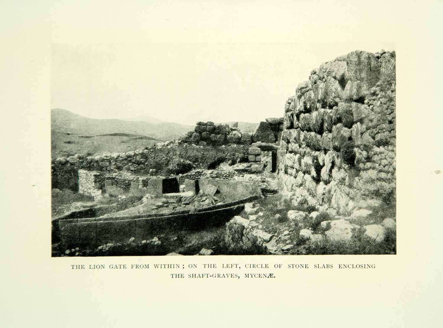 This is an original 1909 black and white halftone print of a photograph of the ruins of the Lion Gate inside the ancient Greek fortress at the archeology site in Mycenae, Greece, Europe.