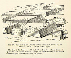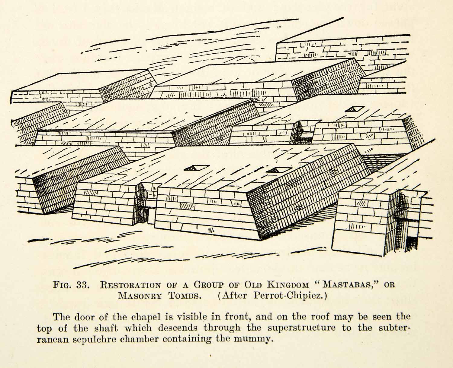 This is an original 1909 black and white relief line-block print that depicts a group of Old Kingdom Egyptian mastabas, or masonry tombs.