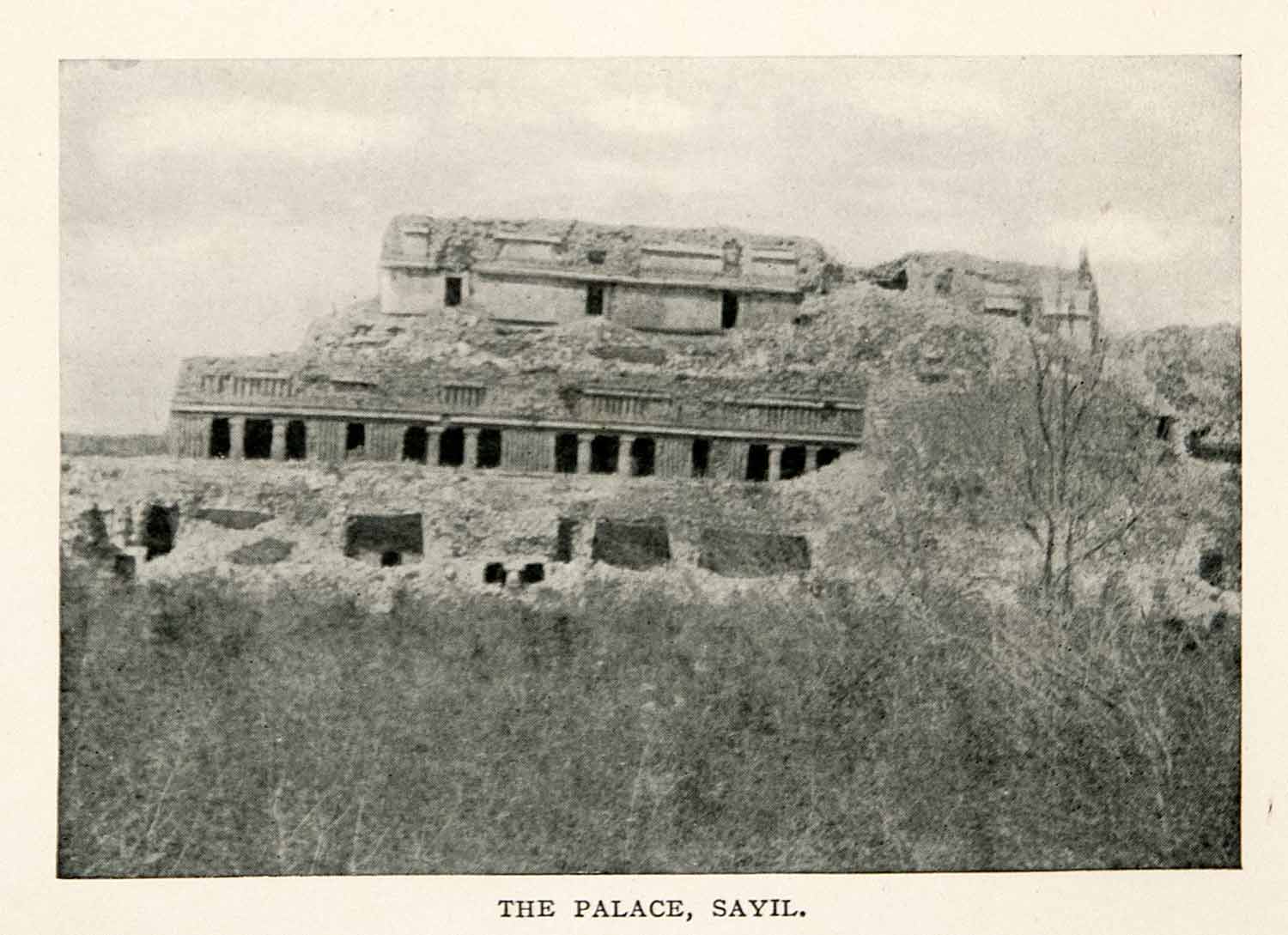 This is an original 1909 black and white halftone print of the ruined palace at the Maya Archaeological site of Sayil. This site is located on the Yucatan Peninsula in Mexico and was first settled in 800 AD.