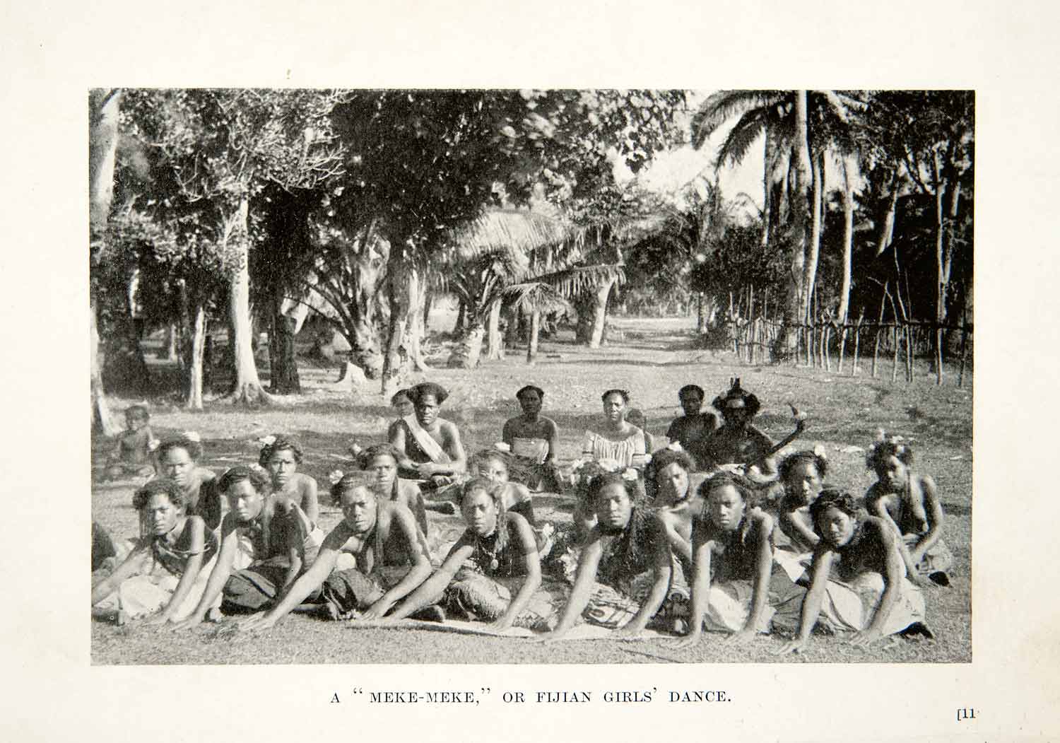 This is an original 1909 black and white halftone print of a group of Fijian girls dancing. The caption calls this a "Meke-Meke."