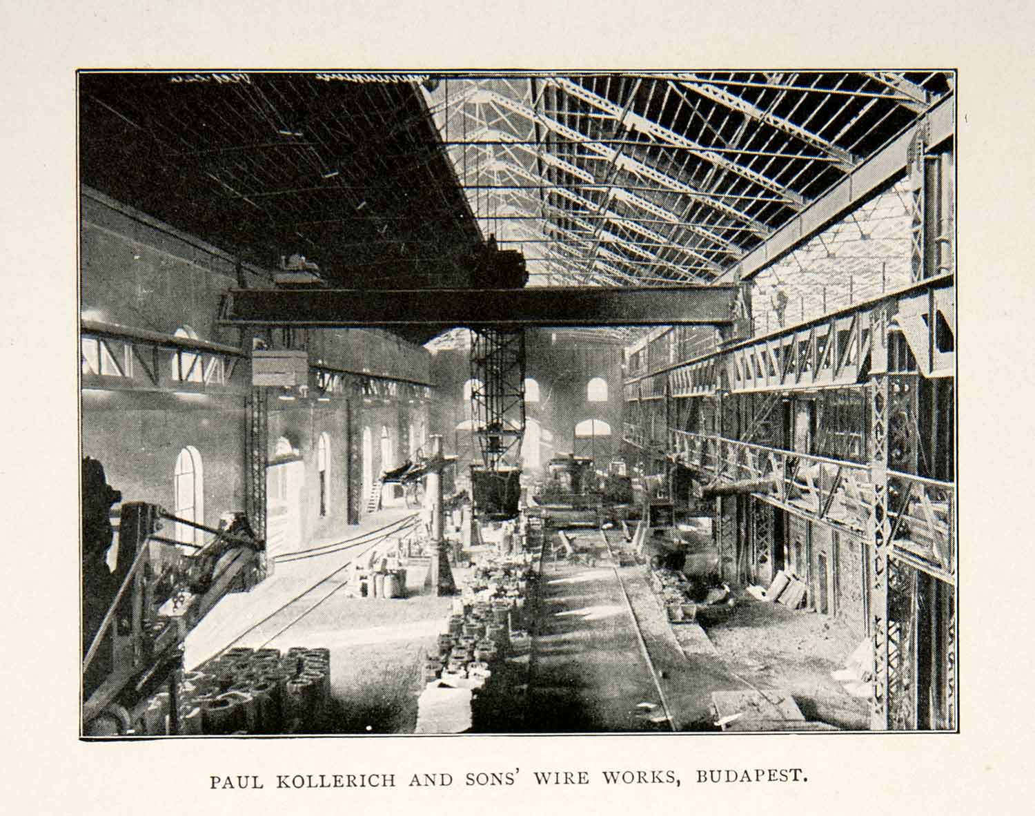 This is an original 1909 black and white halftone print of an interior view of Paul Kollerich and Sons' Wire Works factory in Budapest, Hungary.