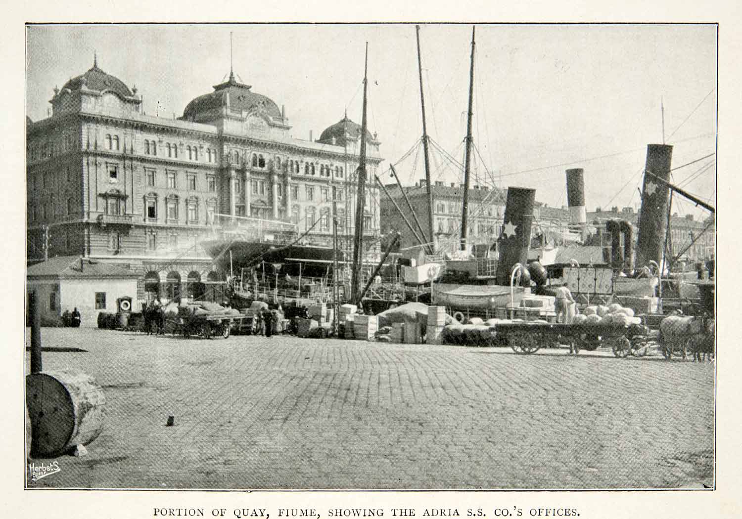 This is an original 1909 black and white halftone print of a historic image of the dock at Fiume, which is presently known as Rijeka in Croatia. This image also shows the offices of the Adria S. S. Company.