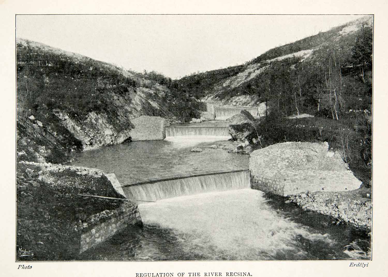 This is an original 1909 black and white halftone print of the regulation of what we assume to be the Resita (Recsina) River in Romania.