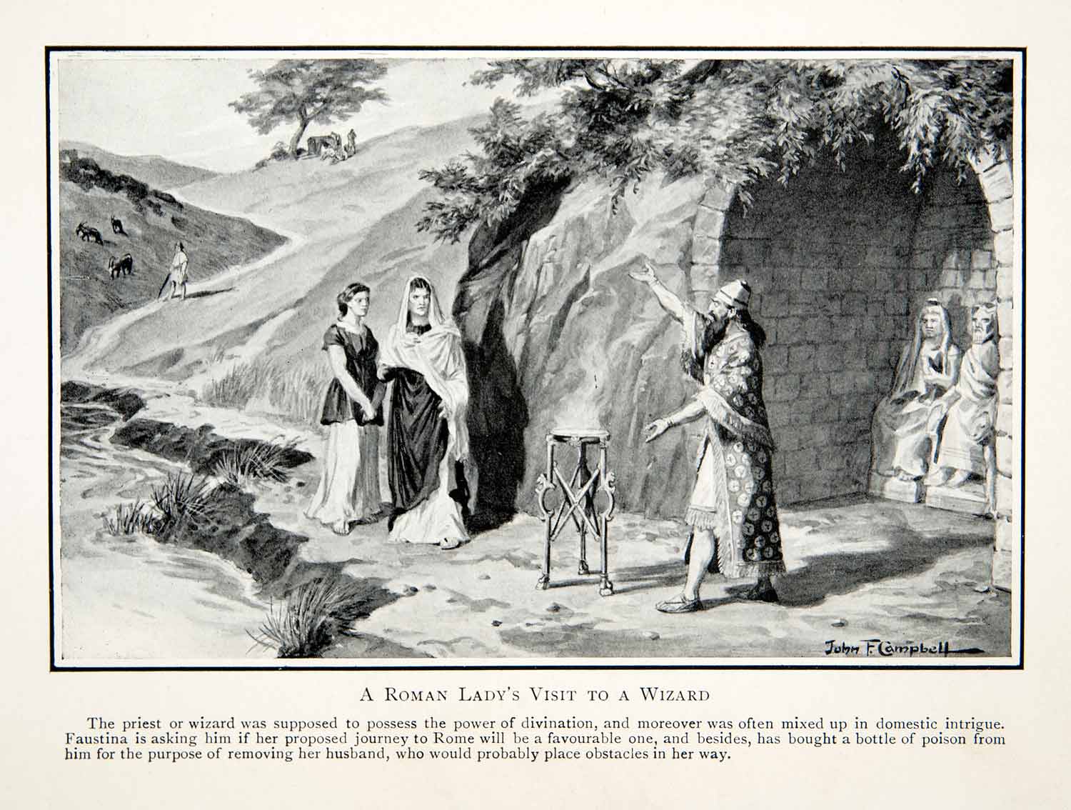 This is an original 1909 black and white halftone print of Roman noblewoman, Faustina, visiting a British wizard (no, not Harry Potter), in order to be told her fortune and pick up a bottle of poison to be used on her husband when she returns home.
