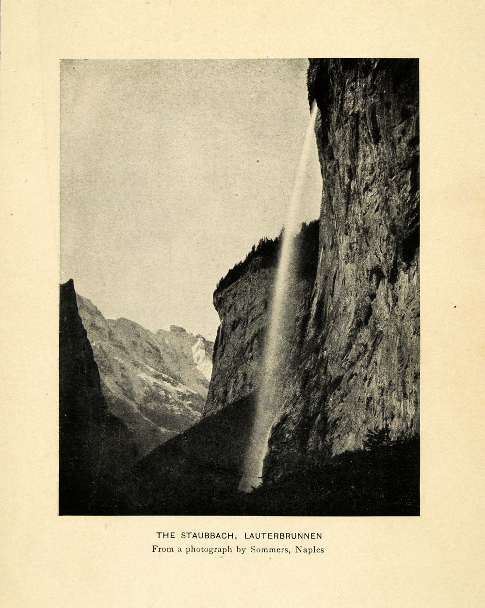 This is an original 1909 halftone print of Staubbach Falls in Lauterbrunnen, Switzerland (die Schweiz). The water cascades down a cliff from the Lütschine River, and drops over 1,000 feet.