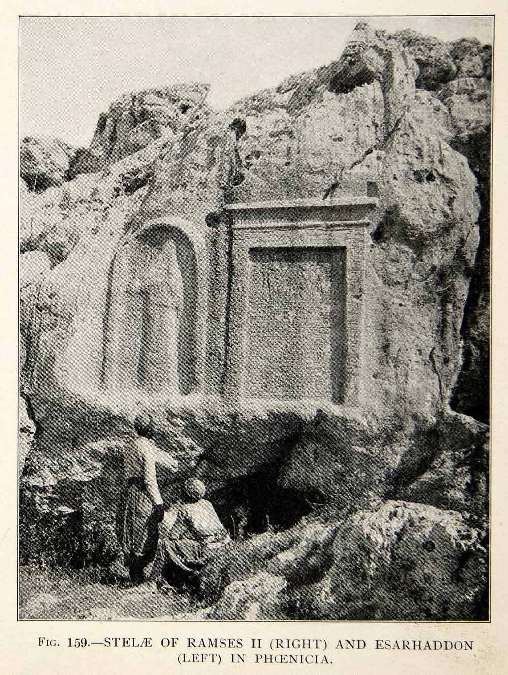 This is an original 1909 black and white halftone print that depicts the stele of Ramses II and Esarhaddon in Phoenicia. They are hewn into the limestone cliffs at the mouth of the Nah rel-Kelb (Dog River) near Beirut.