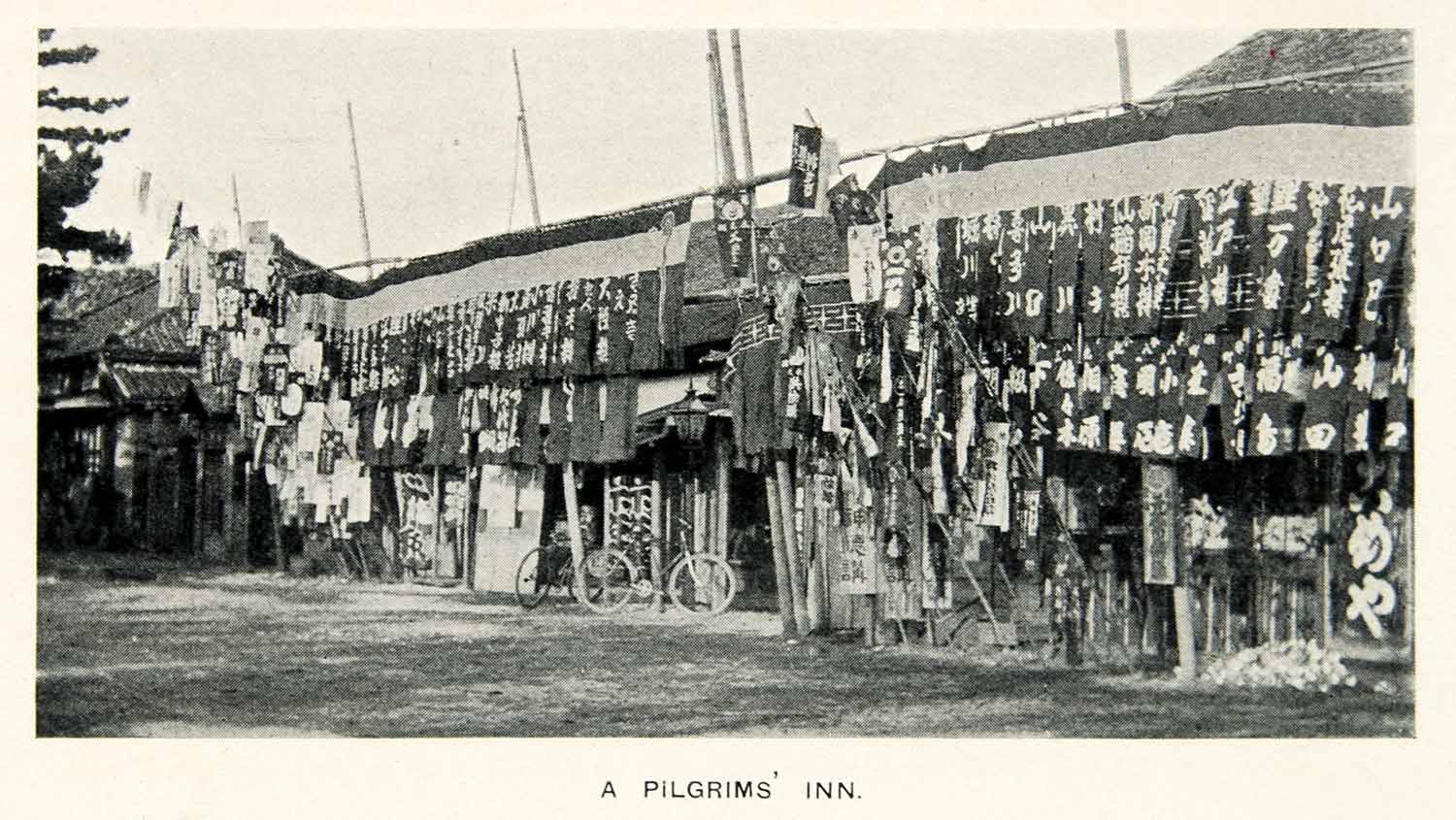 This is an original 1909 black and white halftone print of the Togawa-Ke Oshi-no-Ie (Pilgrim's Inn) in Tokyo, Japan. These rest areas served as way points for pilgrims to Mount Fuji.
