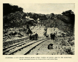 This is an original 1909 halftone print of the starting of a cut into the hillside on the watershed between the Pequest River and Lubber Run during train track construction for a railway.