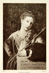This is an original 1909 sepia halftone print of a portrait of Tullia d'Aragona, a famous 16th-century Italian courtesan. Moretto da Brescia painted her as Salome.