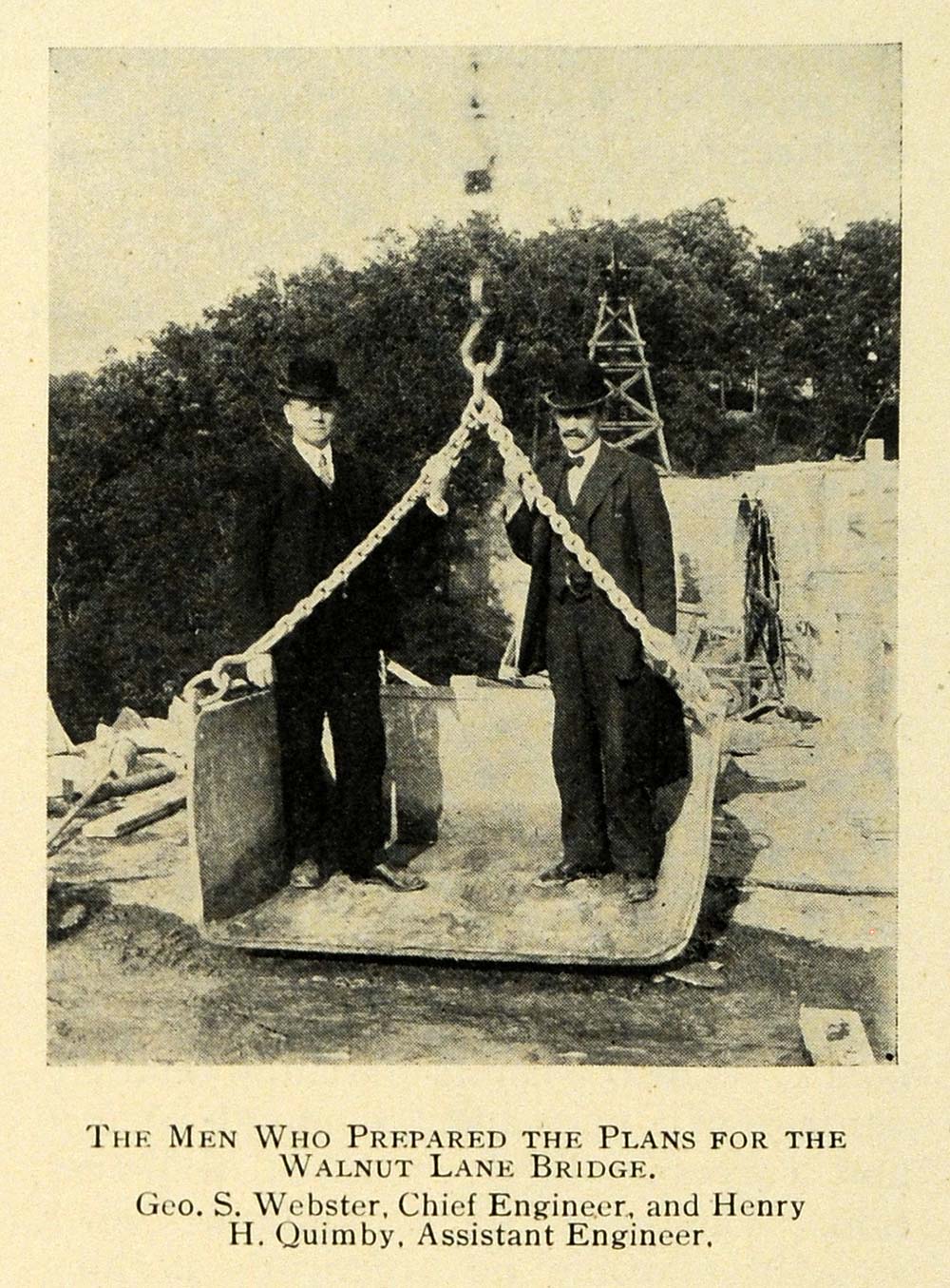 This is an original 1909 halftone print of George S. Webster and Henry H. Quimby-- the men who planned the Walnut Lane Bridge in Philadelphia, Pennsylvania. The bridge stemmed from the City Beautiful project of the early 1900s, and connected the neighborhoods of Roxborough and Germantown.