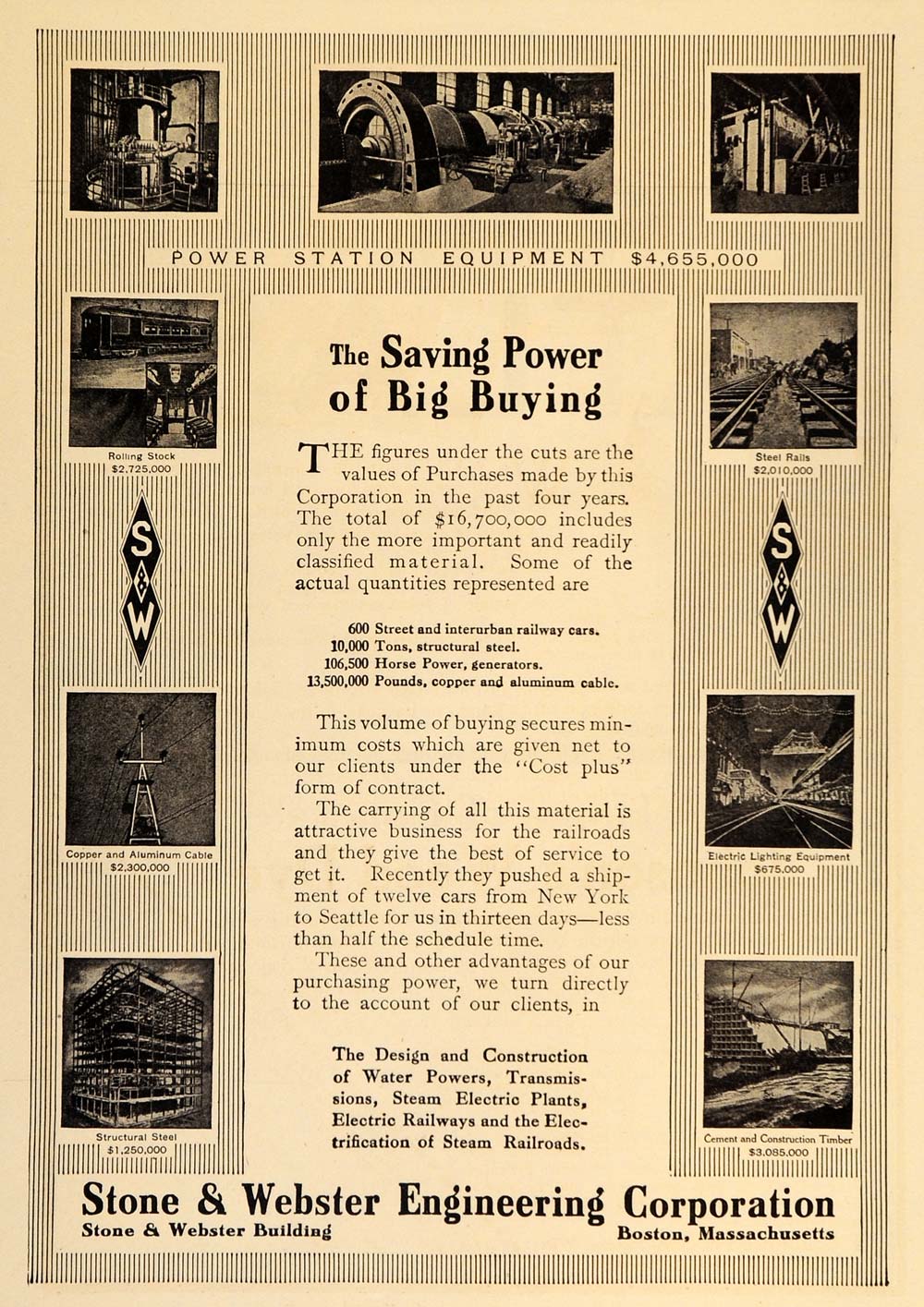 This is an original 1909 black and white print ad for the Stone & Webster Engineering Corporation of Boston.