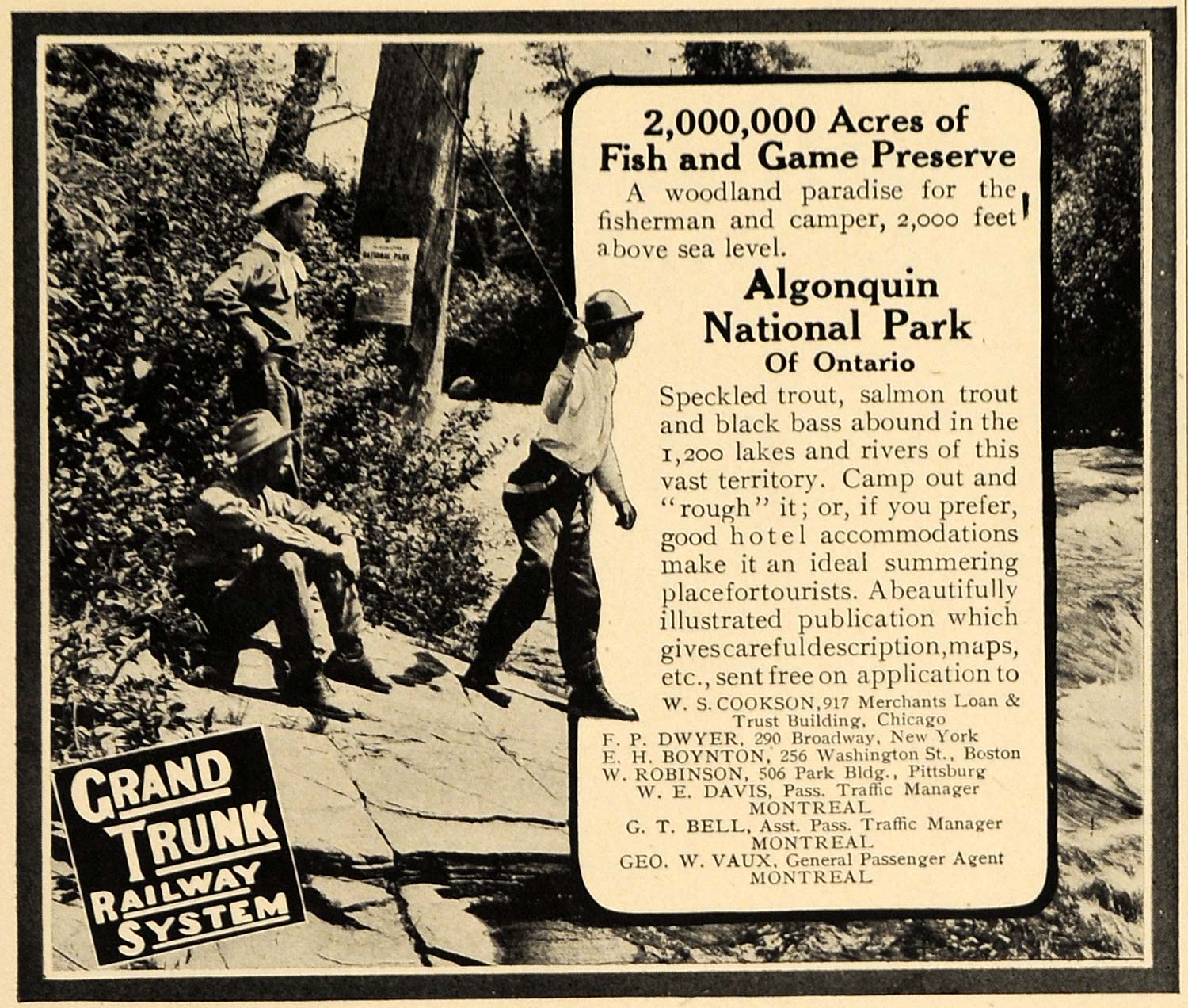 This is an original 1910 black and white print ad for Algonquin National Park from the Grand Trunk Railway System.