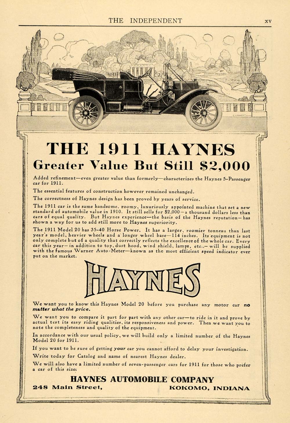 This is an original 1910 black and white print ad for the 1911 Haynes five passenger automobile, a product by the Haynes Automobile Company, located at 248 Main Street in Kokomo, Indiana.
