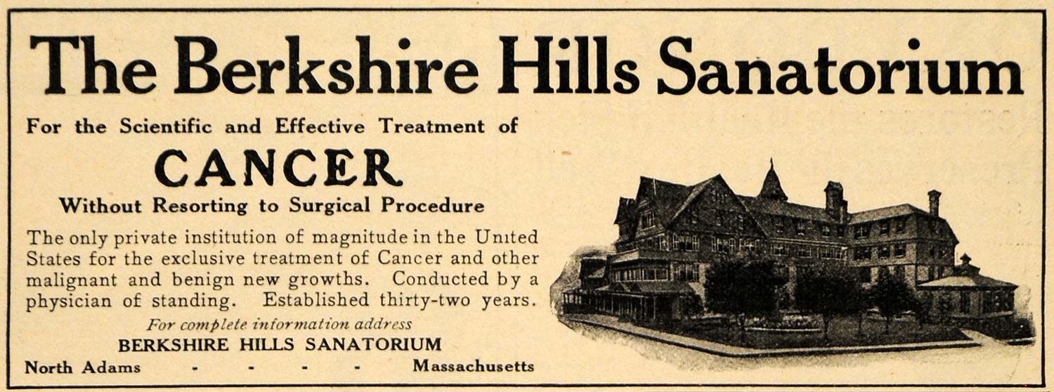 This is an original 1910 black and white print ad for the Berkshire HIlls Sanatorium, specializing in the treatment of Cancer.