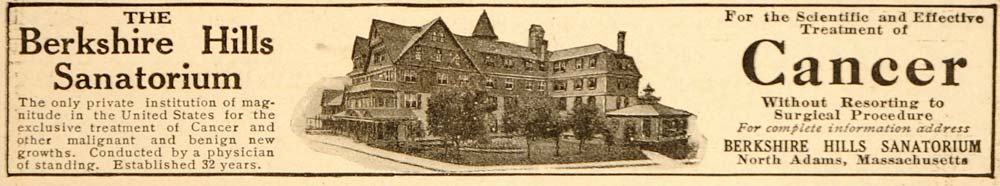 This is an original 1910 black and white print ad for The Berkshire Hills Sanatorium, North Adams, Mass.-- "For the Scientific and Effective Treatment of Cancer without Resorting to Surgical Procedure."
