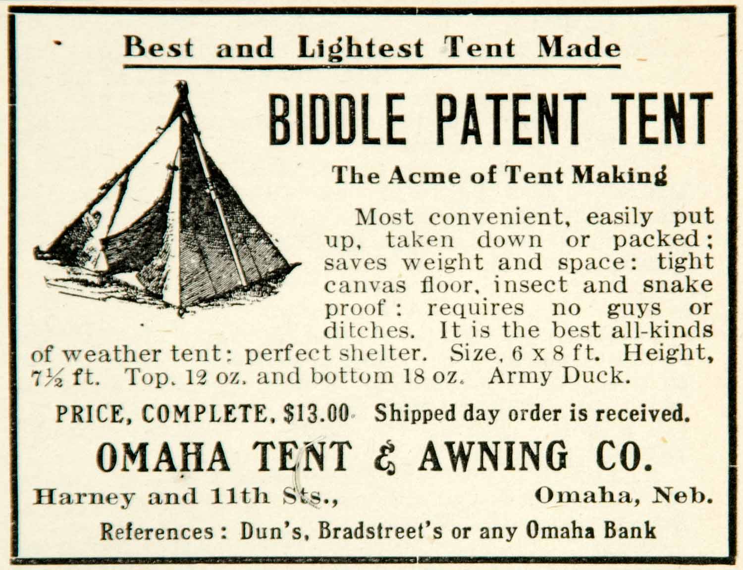 Keywords specific to this image: Vintage Advertising, Canvas, Outdoors, Sporting Goods, Company, Nature, Trip, Camp, Nebraska, Street