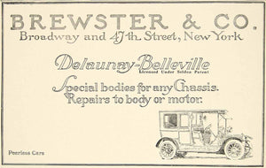 This is an original 1910 black and white print ad for automobile repair services for Delaunay-Belleville sedans that were offered by Brewster & Co. of Broadway and 47th Street, New York, NY during the Edwardian era.