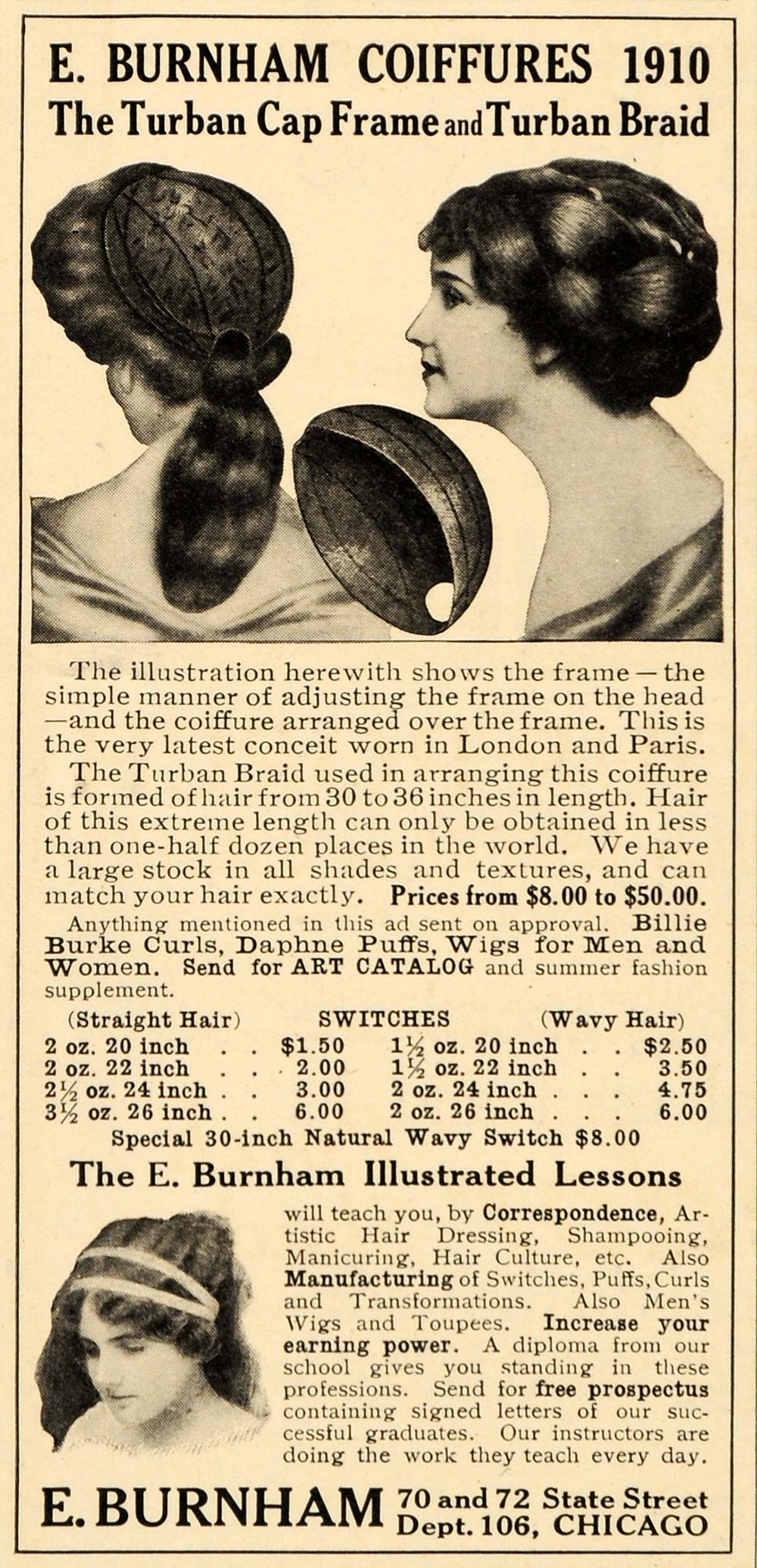 This is an original 1910 black and white print ad for E. Burnham Coiffures 1910 The Turban Cap Frame and Turban Braid by E. Burnham located at 70 and 72 State Street, Department 106, Chicago, Illinois.