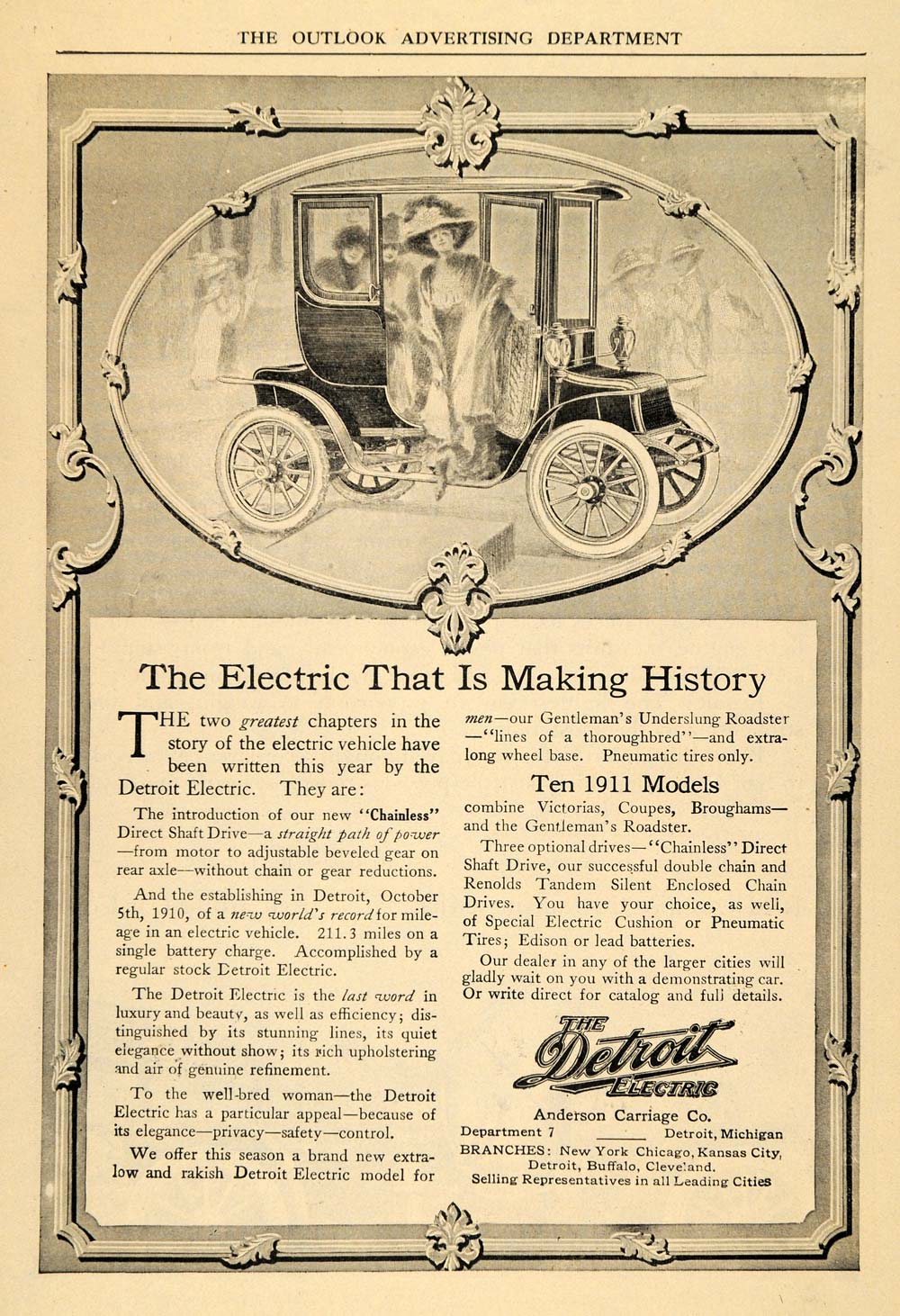 This is an original 1910 black and white print ad for the new Detroit Electric "Chainless" Direct Shaft Drive automobiled by the Anderson Carriage Company located in Detroit, Michigan.