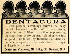 This is an original 1910 black and white print ad for Dentacura Tooth Paste.