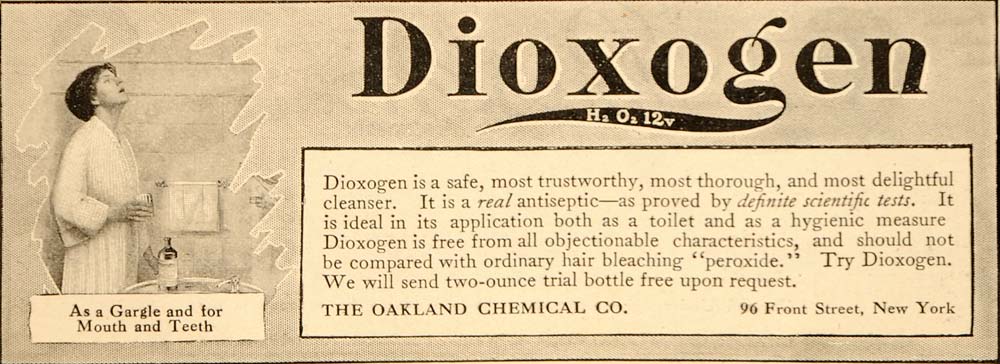 This is an original 1910 black and white print ad for Dioxogen -- an antiseptic cleanser for toilet and hygienic use, from The Oakland Chemical Company, 96 Front Street, New York City.