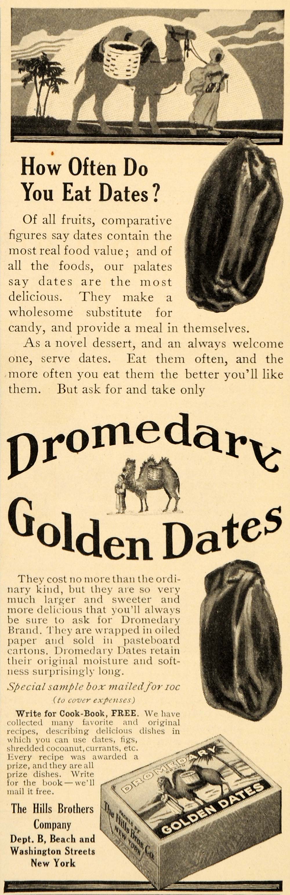 This is an original 1910 black and white print ad for Dromedary Golden Dates by The Hills Brothers Company located at Department B, Beach and Washington Streets, New York City, New York.