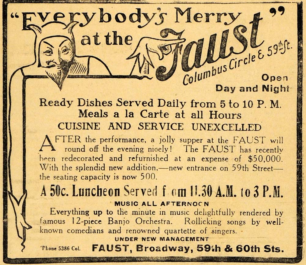 Keywords specific to this image: comedy, show, diner, dining, dinner, meal, eat, eating, cafe, Columbus Circle, 59th Street, New York, dishes, music, musical Vintage Advertising