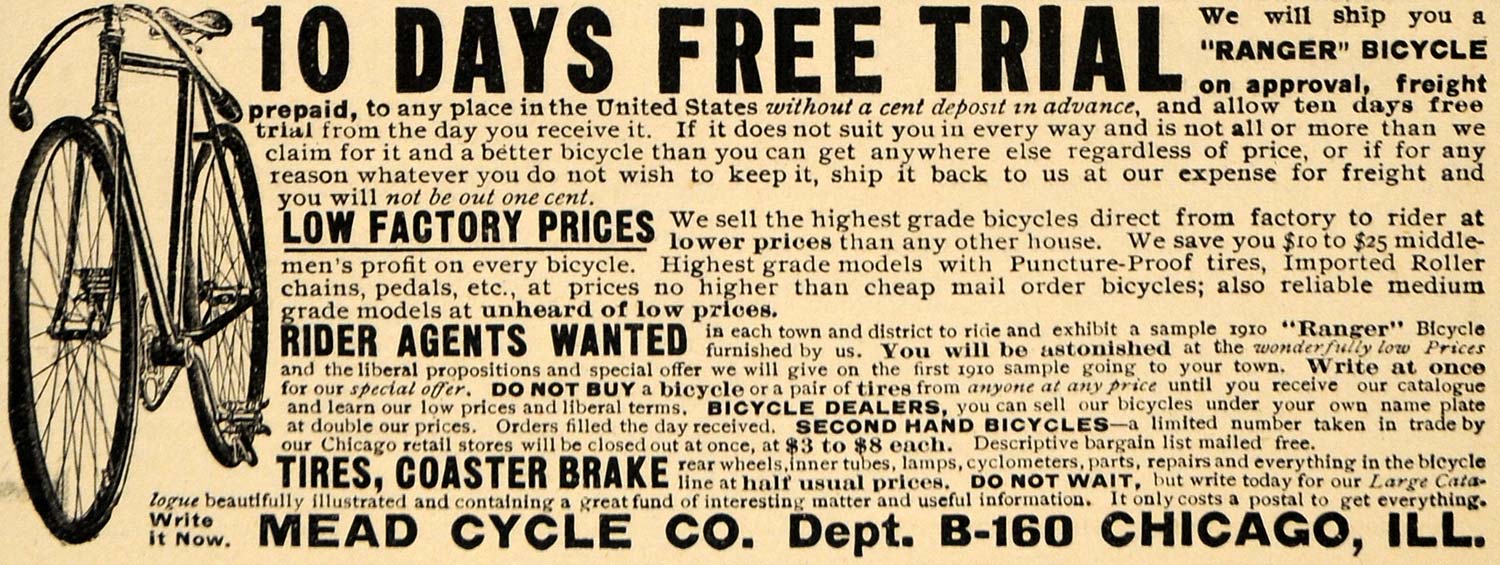 This is an original 1910 black and white print ad for Mead's 10 Day Free Trial of the company's Ranger Bicycle.