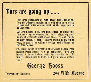 This is an original 1910 black and white print ad for George Booss furs. The ad writes, "Furs are going up... but large purchases of high grade skins, made before the advance, enables us to sell them from stock or take orders for custom work at the same prices as last year."
