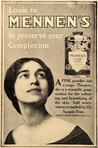 This is an original 1910 black and white print ad promoting the Mennen's Flesh Tint Talcum from Gerhard Mennen Company located in Newark, New Jersey.
