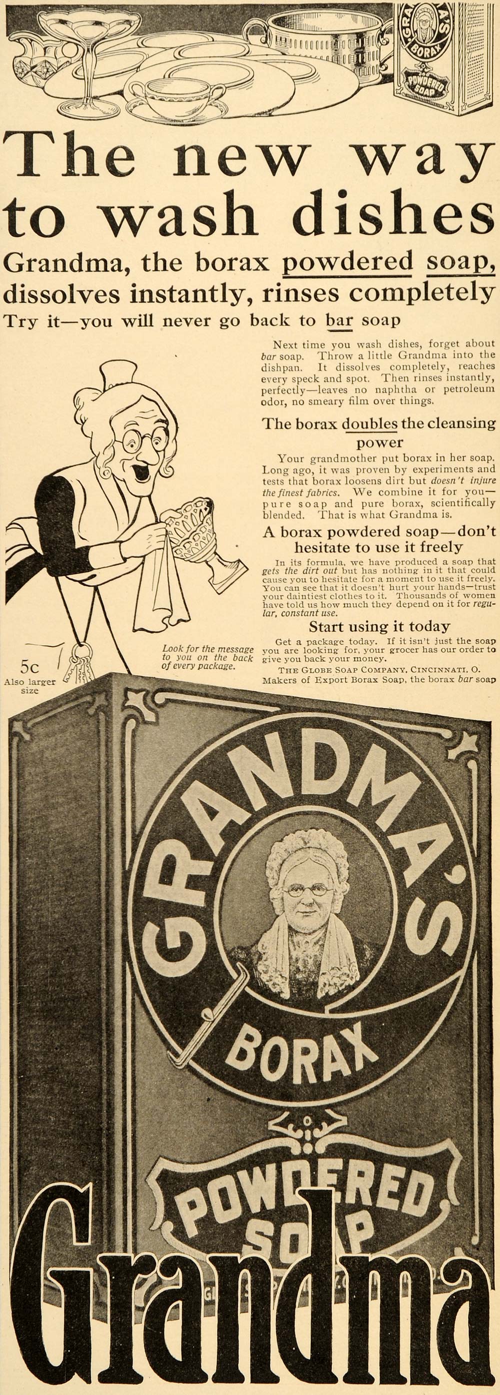 This is an original 1910 black and white print ad for Grandma's Borax Powdered Soap from The Globe Soap Co. located in Cincinnati, Ohio.