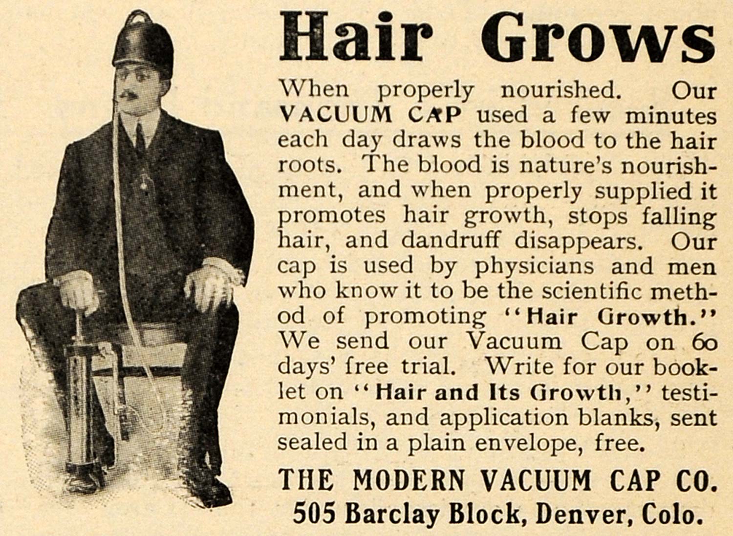 This is an original 1910 black and white print ad for the Modern Vacuum Cap for hair growth.