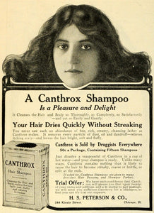 This is an original 1910 black and white print ad for Canthrox Shampoo, a product by H. S. Peterson and Company, located at 244 Kinzie Street in Chicago.