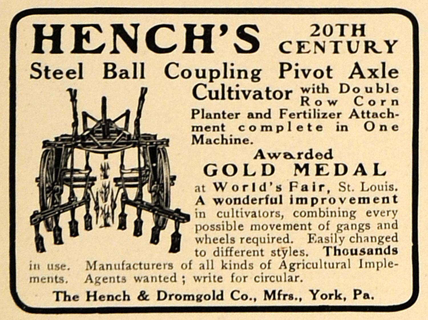 This is an original 1910 black and white print ad for Steel Ball Coupling Pivot Axle Cultivator from The Hench & Dromgold Co. located in York, Pennsylvania.