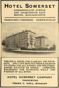 This is an original 1910 black and white print ad for Hotel Somerset located on commonwealth Avenue and Charlesgate East in Boston, Massachusetts.